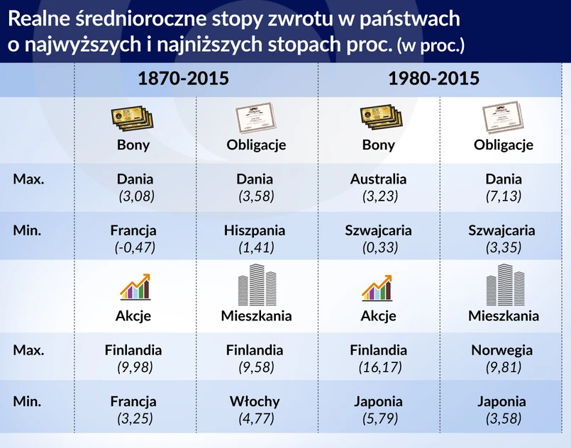 W trybie publicystycznym wskazać można, że najwyższe zwroty na mieszkaniach i akcjach wystąpiły w krajach na uboczu, gdzie wszystko dzieje się paradoksalnie w wolniejszym tempie, a więc bez nadmiernego ryzyka. Najgorzej w tych kategoriach aktywów wypadły Francja, Włochy, a w kilku ostatnich dekadach Japonia. W pierwszym wypadku mamy do czynienia z gospodarką historycznie mocno etatystyczną. Włochy trapione były brakiem przewidywalności politycznej (dyktatura, a potem niezliczone gabinety rządowe), a ich gospodarka deformowana była wpływami mafii i korupcją. Japonia to z kolei przykład gospodarki bogatej i nasyconej, działającej w mocno dojrzałym wiekowo społeczeństwie, a słuszny wiek ma to do siebie, że ludzie nie są tak wyrywni i żądni dóbr wszelakich jak w młodości.