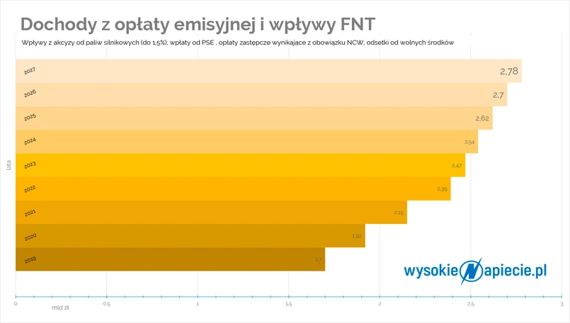 Opłata emisyjna ma przynieść już w przyszłym roku 1,7 mld zł. W pierwszym roku do FNT trafi ok. 255 mln zł. Pieniądze mają wesprzeć inwestycje m.in. w produkcję biopaliw, biometanu i wodoru, stacje tankowania gazu sprężonego (CNG) i płynnego (LNG) oraz infrastrukturę do ładowania samochodów i autobusów elektrycznych. Przewidziano wsparcie zakupu nowych pojazdów i jednostek pływających zasilanych biopaliwami ciekłymi, CNG, LNG, wodorem, wykorzystujących do napędu energię elektryczną. Część pieniędzy ma iść także na badania i rozwój oraz edukację w zakresie paliw alternatywnych.