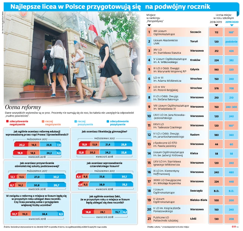 W tym roku do najlepszych liceów w Polsce zostanie przyjętych ponad 3400 uczniów. W kolejnym roku miejsce powinno się znaleźć dla 5500 uczniów – wynika z analizy DGP. Przeprowadziliśmy ankietę w najlepszych placówkach (wybranych na podstawie rankingu Perspektywy), pytając ich dyrekcje o stan przygotowań do września 2019 r. Wówczas do szkół startować będą dwa roczniki – pierwsi absolwenci ósmej klasy oraz ostatni uczniowie gimnazjum. W sumie zamiast 358 tys. uczniów, jak w tym roku, o miejsca w placówkach ponadgimnazjalnych konkurować będzie 772 tys. dzieci.