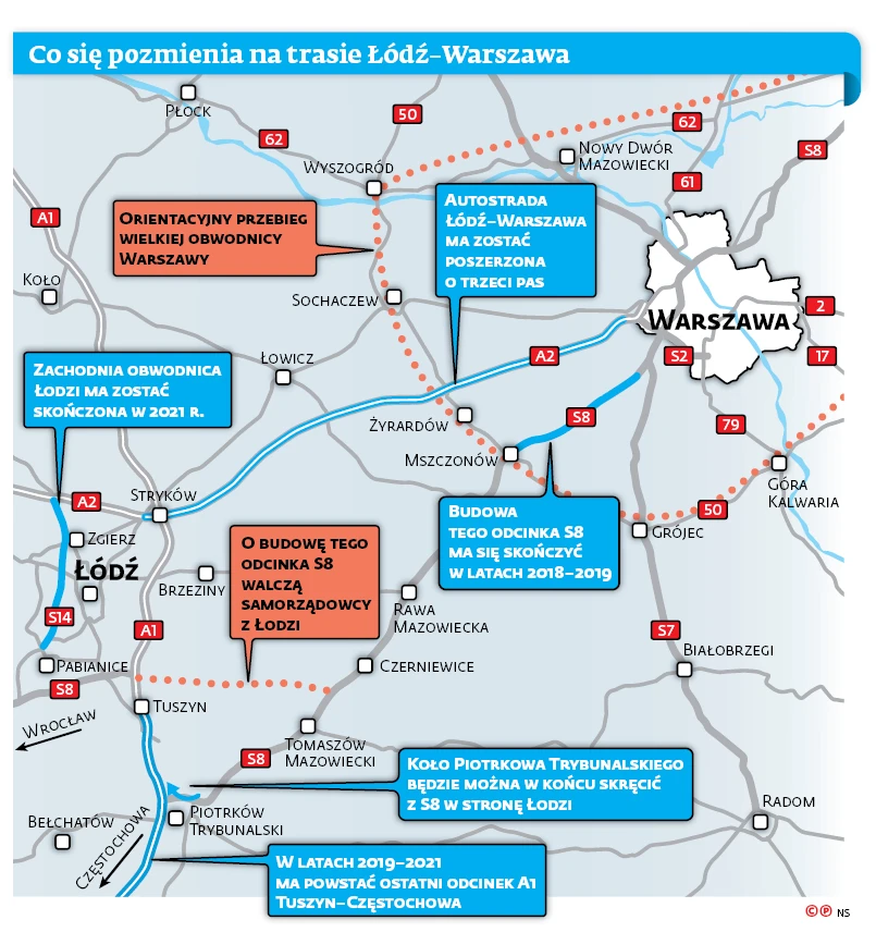 Jednocześnie coraz głośniej słychać o innym pomyśle na odkorkowanie trasy A2. Samorządowcy z Łodzi i okolic zaczęli mocno promować pomysł wyprostowania trasy S8 w łódzkiem, gdzie arteria nie ma ciągłości. To skutek decyzji byłego ministra infrastruktury Cezarego Grabarczyka, który uznał, że fragment S8 trzeba przybliżyć do Łodzi, bo dzięki temu powstanie południowy odcinek obwodnicy tego miasta. Skutek jest taki, że ogromna większość kierowców w drodze z Warszawy do Wrocławia najpierw wybiera autostradę A2, przed Łodzią skręca na A1, a dopiero po kolejnych 30 km wjeżdża na trasę S8.