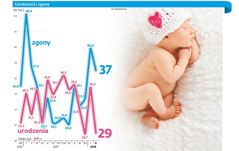 Mały baby boom, którego świadkami jesteśmy od końca 2016 r., zaczyna tracić impet. W lutym urodziło się 29 tys. dzieci, podczas gdy 12 miesięcy wcześniej było ich 31,2 tys. – podał wczoraj GUS. Luty to po listopadzie i grudniu kolejny miesiąc, w którym narodzin było mniej niż rok temu w analogicznym czasie. Nieco lepiej było w styczniu, kiedy przyszło na świat o 800 maluchów więcej niż na początku 2017 r. Ale w dużej mierze mógł to być efekt statystyczny. W styczniu tego roku było mniej weekendów, a w soboty i niedziele nie przeprowadza się planowych zabiegów cesarskiego cięcia. Jeden dodatkowy weekend to kilkaset urodzeń więcej.