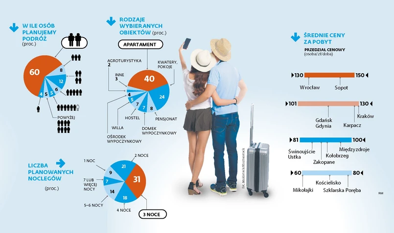 Jeśli chodzi o najczęściej wybierany typ obiektu, to przodują noclegi w apartamentach (40 proc.) oraz kwaterach i pokojach (24,1 proc.). Znacznie mniejszym zainteresowaniem cieszą się pensjonaty (8 proc.), domki wypoczynkowe (7 proc.) czy hostele (6,8 proc.). ⒸⓅ