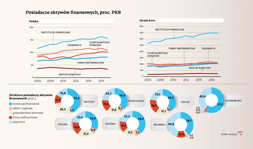 Jak jednak wskazują dane Eurostatu, unijnego biura statystycznego, pod względem zaangażowania zagranicy w gospodarkę wcale nie różnimy się od innych państw UE. Porównanie dotyczy wartości aktywów finansowych należących do różnych sektorów gospodarki. Obejmują one gotówkę, depozyty, pożyczki, akcje i udziały firm aż po jednostki funduszy inwestycyjnych czy należności od firm ubezpieczeniowych i emerytalnych. W statystykach nie są uwzględniane rzeczy ruchome oraz nieruchomości (chyba że – jak często zdarza się w biznesie – są one wnoszone aportem jako kapitał do firm lub tworzona jest spółka celowa do zarządzania nieruchomością).