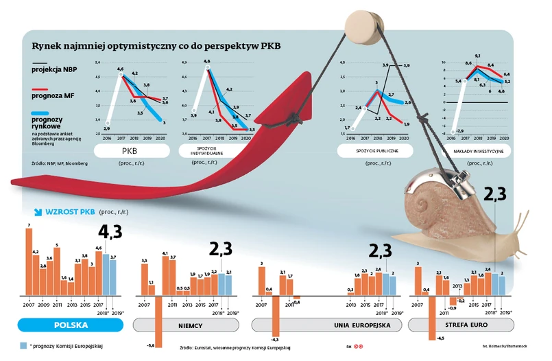 – Jak głębokie będzie wyhamowanie? Wskazówką może być projekcja NBP – mówi Mateusz Sutowicz z Banku Millennium. Wynika z niej, że w przyszłym roku wzrost spowolni do 3,8 proc., a do 3,6 proc. w 2020 r. Podobne prognozy prezentuje Ministerstwo Finansów (3,8 proc. i 3,7 proc.). Jednak gdy popatrzymy na prognozy ośrodków międzynarodowych, sprawa wygląda mniej różowo. Europejski Bank Odbudowy i Rozwoju wprawdzie podniósł wczoraj prognozę wzrostu dla Polski na ten rok aż o 0,6 pkt proc., do 4 proc., ale już w przyszłym spodziewa się, że PKB urośnie tylko o 3,3 proc. Międzynarodowy Fundusz jest tylko odrobinę bardziej optymistyczny i widzi tempo rozwoju w 2019 r. na poziomie 3,5 proc.