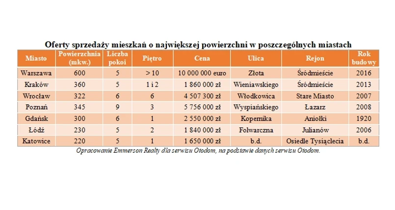 W Warszawie największe mieszkanie, a właściwie penthouse czekający na kupca, jest zlokalizowany w Złotej 44. Obecnie jest to jeden z najbardziej prestiżowych stołecznych adresów. Mieszkanie ma powierzchnię okrągłych 600 mkw., na których rozlokowanych jest pięć pokoi.