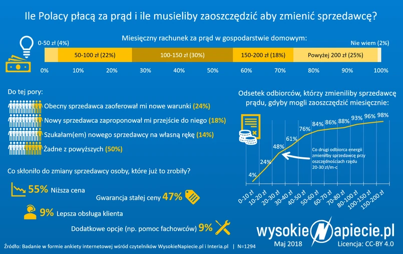 Dlatego dziennikarze portali WysokieNapiecie.pl i Interia.pl postanowili zadać grupie ponad tysiąca Polaków pytania o zmianę sprzedawcy energii elektrycznej. W badaniu wzięło udział 1294 czytelników obu portali.