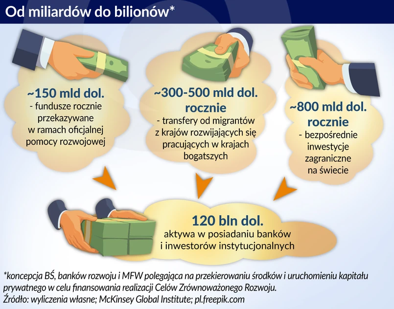 Te „miliardy” to fundusze przekazywane od lat w ramach oficjalnej pomocy rozwojowej (ok. 150 mld dol. rocznie), transfery od migrantów z krajów rozwijających się, pracujących w krajach bogatszych (ok. 300-500 mld dol. rocznie) oraz zagraniczne inwestycje bezpośrednie (ok. 800 mld dol. rocznie, w tym w krajach rozwijających się ok. 200-300 mld dol). Ich mądre zainwestowanie ma m.in. umożliwić uruchomienie „bilionów” będących w dyspozycji inwestorów prywatnych (banków, towarzystw inwestycyjnych, firm ubezpieczeniowych, itp.), do tej pory nieinwestowanych w dużej skali w krajach rozwijających się i niewykorzystywanych do finansowania projektów rozwojowych, przede wszystkim w zakresie infrastruktury gospodarczej i społecznej. Stawka jest wysoka – według wyliczeń McKinsey Global Institute, inwestorzy instytucjonalni i banki posiadają aktywa o łącznej wartości ok. 120 bln dol.