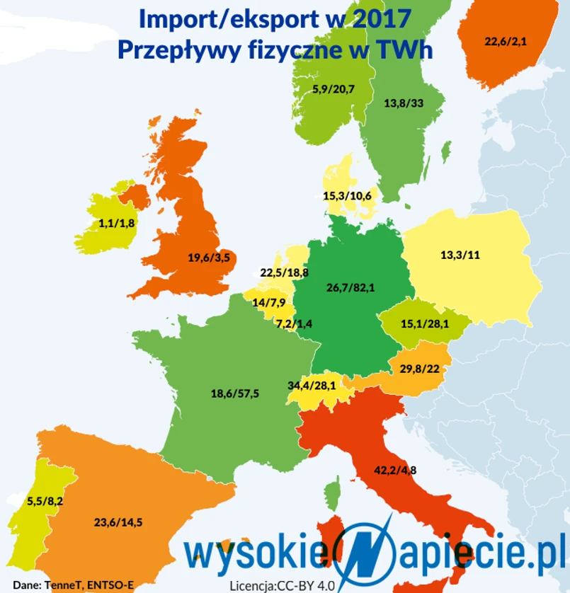 W liczbach wygląda to następująco: zza granicy w 2017 r. fizycznie przypłynęło 13,3 TWh, z czego import wyniósł 6,8 TWh. Za granicę wypłynęło natomiast 11 TWh, z tego 4,2 TWh eksportu. Przez granicę z Niemcami fizyczny przepływ wyniósł 7,3 TWh w stronę Polski i zero w kierunku przeciwnym.