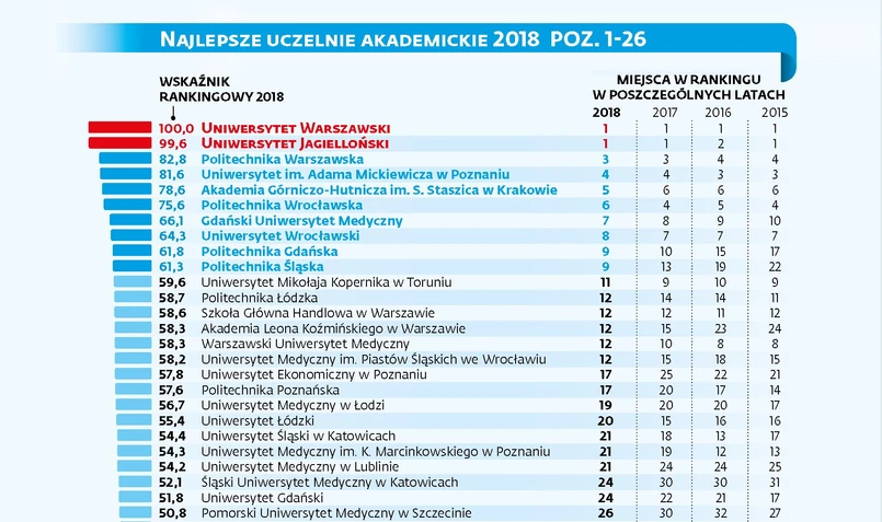 W rankingu PerspektywUniwersytet Warszawski i Uniwersytet Jagielloński od lat rywalizują o palmę pierwszeństwa. W tym roku stołeczna szkoła wyższa cieszy się najwyższym uznaniem międzynarodowym, wygrywa, jeśli chodzi o preferencje pracodawców i liczbę uprawnień do nadawania stopnia doktora. Uczelnia z Krakowa pokonała pozostałe między innymi dzięki dobrej ocenie kadry akademickiej. Ostateczny wynik – w którym brano pod uwagę 30 wskaźników – zagwarantował obu uczelniom tę samą punktację. W efekcie obie mogą cieszyć się tytułem najlepszej uczelni akademickiej w Polsce. UW i UJ to również jedyne nasze szkoły wyższe notowane w prestiżowym międzynarodowym Rankingu Szanghajskim.