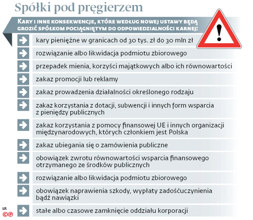 To najczarniejszy scenariusz, który przewiduje nowa ustawa o odpowiedzialności spółek i innych podmiotów zbiorowych. Projekt wczoraj trafił do konsultacji. Główne założenie jest takie, że firmy mają ponosić dotkliwe konsekwencje zarówno za świadome nadużycia członków zarządu, jak i zaniedbania w nadzorze nad biznesem skutkujące np. śmiertelnymi wypadkami przy pracy, skażeniem środowiska czy wypuszczeniem na rynek wadliwych szczepionek.