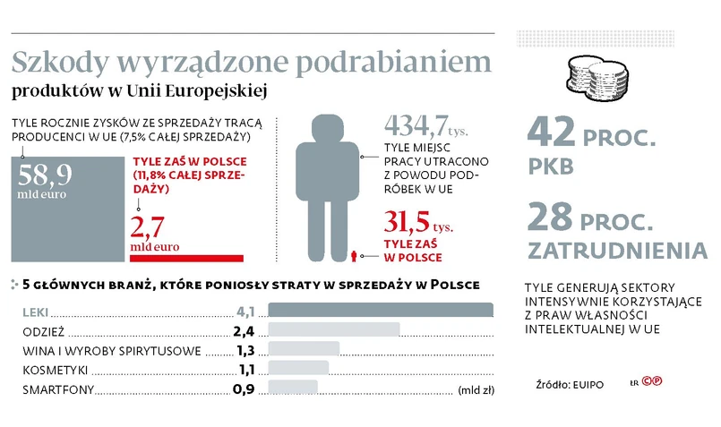 Rocznie z powodu sprzedaży fałszywek do polskich producentów i sprzedawców nie trafia 11,4 mld zł. To 12 proc. całej sprzedaży w sprawdzonych przez EUIPO sektorach gospodarki.