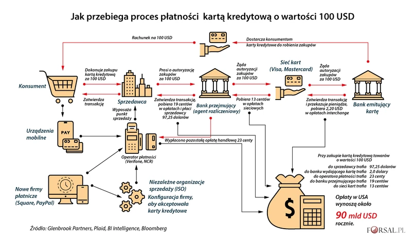 Natomiast konsumenci w USA realizując bezgotówkowe płatności, takie jak czek, debet, kredyt, czy rosnąca liczba innych systemów płatności powiązanych z ich kontami, wciąż polegają głównie na bankach, płacąc przy tym odpowiednie prowizje.
