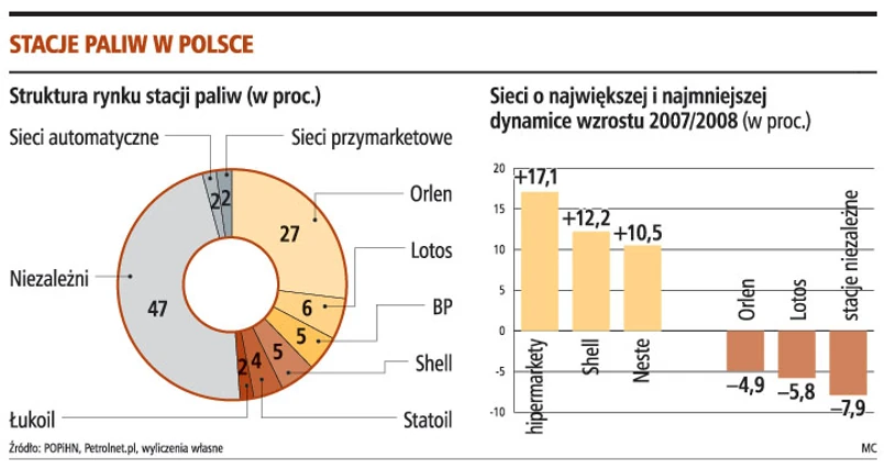 Zdaniem ekspertów jedyne sieci paliwowe, które mogą zyskać na trudnej sytuacji gospodarczej, to te należące do hiper- i supermarketów. Jak podkreśla Marcin Szczepański z portalu Petrolnet, ten segment rynku rozwija się najszybciej, będzie też przynosił coraz większe przychody. Stacje przymarketowe sprzedają kilka razy więcej paliw niż operatorzy niezależni, a kryzys może jeszcze zwiększyć różnicę. Przemawia za tym konkurencyjność cenowa tych obiektów.