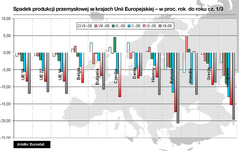 W porównaniu z sytuacja sprzed roku produkcja zmniejszyła się o 12 procent – wynika z opublikowanego w czwartek raportu Eurostatu, unijnej agendy statystycznej. To znacznie więcej o spadku rzędu 9,3 proc., prognozowanego przez ekonomistów ankietowanych przez agencję Bloomberg. Jednocześnie jest to najgorszy wynik od 1986 roku, od kiedy gromadzone są dane dla regionu. W ciągu miesiąca – grudzień do listopada – produkcja skurczyła się o 2,6 procent.