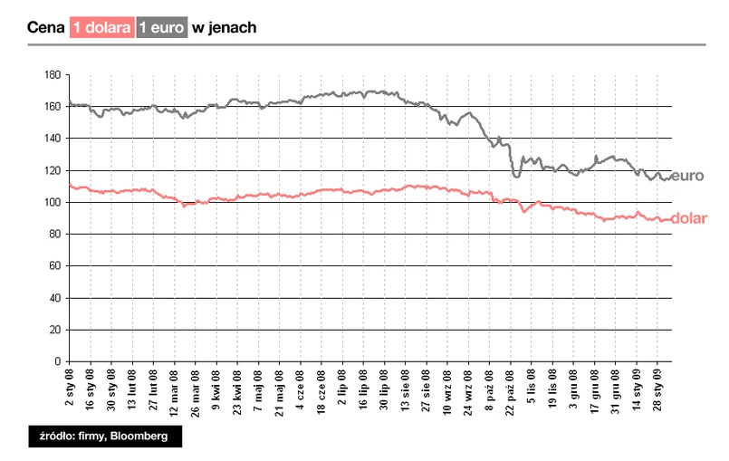 W chwili gdy Polacy narzekają na słabość złotego, Japończycy mają coraz bardziej mieszane uczucia co do... siły swojej waluty. W zeszłym roku jen zyskał od kilkunastu do kilkudziesięciu procent wobec 177 walut, co z jednej strony zachęciło tamtejszych inwestorów do zagranicznych inwestycji, ale jednocześnie mocno zabolało japońskich eksporterów.