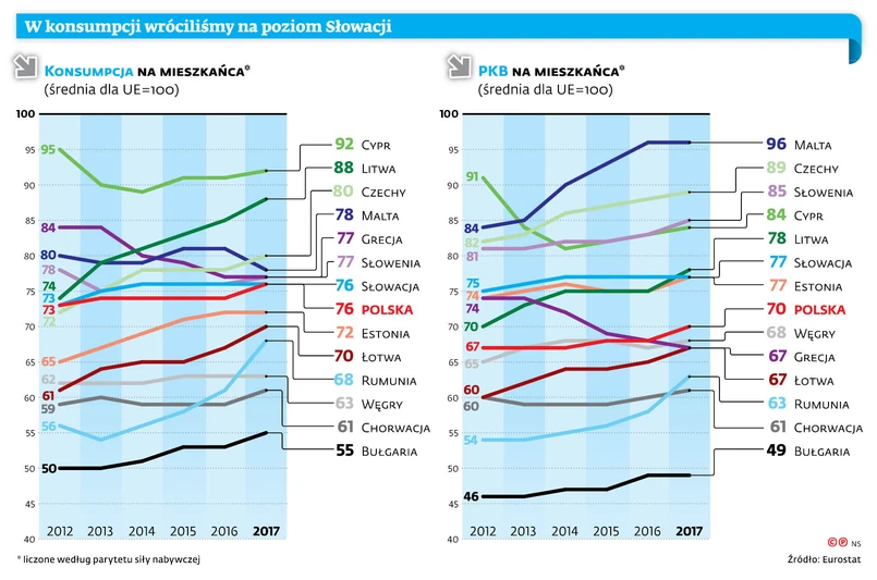 Statystyki Eurostatu pozwalają na porównanie nie tylko produktu wytwarzanego przez statystycznego mieszkańca każdego z europejskich krajów, ale także jego konsumpcji. Tu jesteśmy bliżsi średniej unijnej niż w przypadku PKB. Jednak tempo „nadganiania” jest podobne. Pod względem tzw. rzeczywistych wydatków konsumpcyjnych tylko nieznacznie odstajemy od takich krajów, jak Słowenia czy Słowacja.