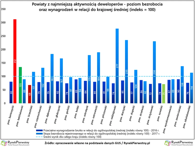 Nawet po uwzględnieniu wspomnianych „mikro - deweloperów” okazało się, że w 2016 r. i 2017 r. na terenie niektórych polskich powiatów, budownictwo na sprzedaż lub wynajem praktycznie nie istniało. Poniższa tabela przedstawia dwadzieścia takich lokalizacji cechujących się bardzo niską aktywnością deweloperów. Warto zwrócić uwagę, że do analizowanej grupy nie trafiło żadne miasto na prawach powiatu.