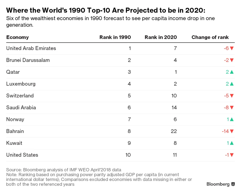 Gwinea Równikowa, jedyny kraj w Afryce, gdzie językiem urzędowym jest Hiszpański, ma zająć 45 miejsce pod względem PKB per capita w 2020 roku, podczas gdy w 1990 zajmowała 146. Skok o ponad 100 miejsc może ona zawdzięczać odkryciu złóż ropy. Chiny będą miały drugi największy skok – o 66 miejsc na pozycję 62 w 2020 roku, wynika z danych MFW zebranych przez Bloomberg.