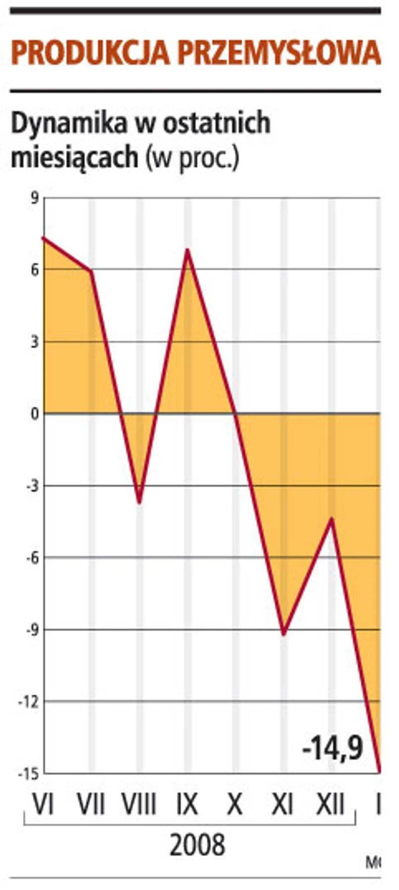 Według analityków takie tempo spadku produkcji, jakie mieliśmy w styczniu, może oznaczać ostre hamowanie dynamiki wzrostu PKB w I kwartale. O ile pod koniec ubiegłego roku wynosiła ona około 3 proc., o tyle w pierwszych trzech miesiącach 2009 roku może to być około 1 proc.