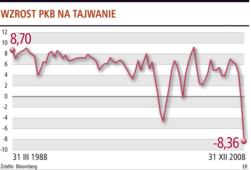Spadek tajwańskiego PKB w 2008 roku o 8,36 procent oznacza największe załamanie gospodarki od 1952 roku, kiedy tamtejsze biuro statystyczne po raz pierwszy opublikowało informacje o tym wskaźniku. Jednocześnie oznacza to, że Tajwan wkroczył w pierwszą recesję od pęknięcia tzw. „bańki internetowej” w 2001 roku.