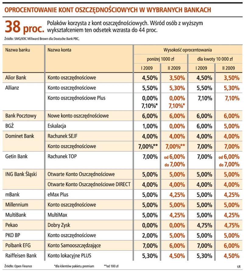 Wniektórych bankach oprocentowanie kont oszczędnościowych spadło w ostatnim miesiącu o 1 pkt proc. - wynika z analizy Open Finance na zlecenie GP. W tej chwili najwyższe odsetki, rzędu 7-8 proc. w skali roku, można dostać na koncie oszczędnościowym w Banku Pocztowym, Allianz Banku, Dominet Banku i Getin Banku. Najczęściej jednak banki, które dają tak wysokie oprocentowanie, starają się zarobić gdzie indziej.