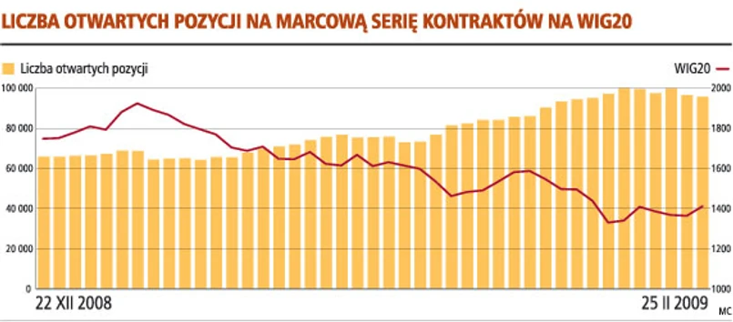 Niemal 100 tys. osiągnęła 18 lutego liczba otwartych pozycji (LOP) w wygasającej 20 marca serii kontraktów terminowych na WIG20. Na ostatnich sesjach LOP utrzymywała się w okolicach 95-96 tys. To poziom zbliżony do notowanego pod koniec listopada. Wtedy chodziło o grudniową serię kontraktów na WIG20. Kilka dni przed jej wygaśnięciem Komisja Nadzoru Finansowego (KNF) zdecydowała się ostrzec rynek przed ryzykiem dużej podaży akcji spółek z WIG20 w ostatniej godzinie notowań w dniu wygasania tej serii kontraktów. Powodem była duża koncentracja krótkich pozycji w ręku jednego zagranicznego inwestora finansowego. Na pięć dni przed jej wygaśnięciem należało do niego 39,53 proc. otwartych pozycji. W przypadku marcowej serii kontraktów Komisja nie widzi na razie takiego zagrożenia.