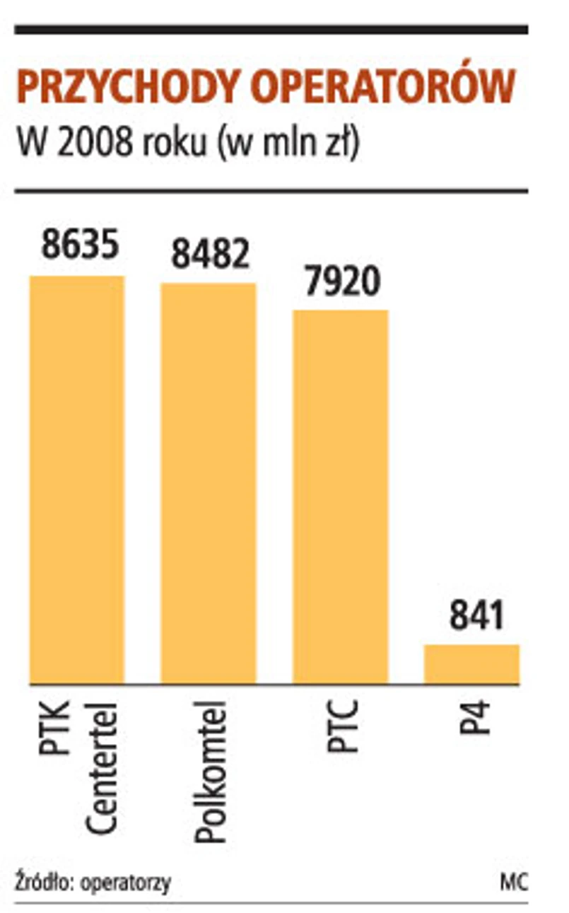 Polkomtel w 2008 roku miał 8 mld 482 mln zł przychodów (8,8 proc. wzrostu r/r). Daje mu to drugie miejsce, po Centertelu (8 mld 635 mln zł). Trzecie jest PTC, które - co ujawniono w piątek - w 2008 roku osiągnęło 7 mld 920 mln zł przychodów. Po uwzględnieniu danych P4 (841 mln zł), łączna wartość sprzedaży czterech największych operatorów to 25 mld 878 zł. Do tego należy doliczyć do 50 mln zł przychodów operatorów wirtualnych. Cały rynek miał więc wartość ponad 25,9 mld zł.