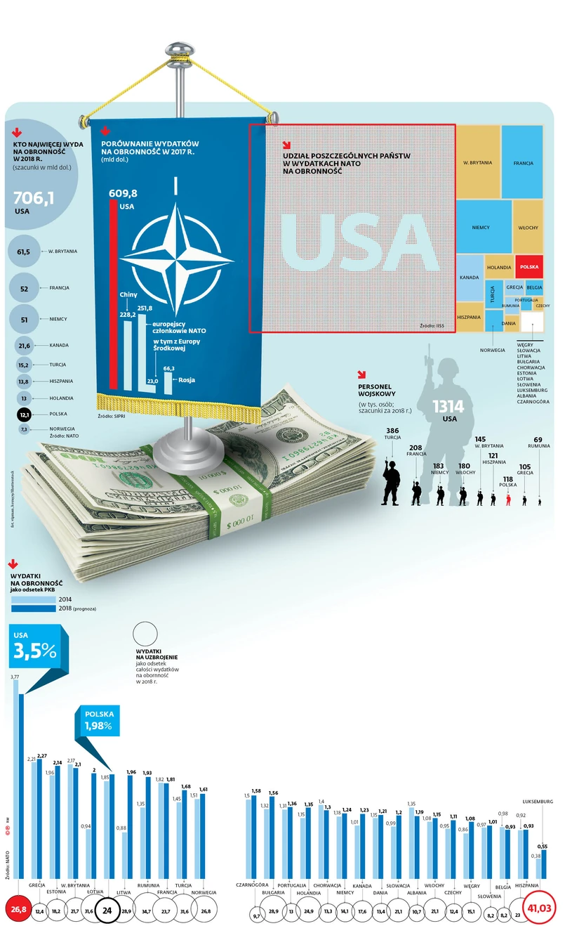 Te decyzje nie budzą kontrowersji i zostały już wcześniej zaakceptowane przez wszystkie państwa należące do organizacji. Na spotkaniu zostanie jednak poruszonych wiele spraw, co do których pełnej zgody między sojusznikami już nie ma. Główną kością niezgody są niedostateczne wydatki, które państwa europejskie ponoszą na obronność. Według wczoraj opublikowanych szacunków na 2018 r. tylko 5 z 29 członków organizacji w 2018 r. wyda na obronność zalecane przez NATO 2 proc. PKB. Niestety, Polska jest tuż poniżej tego progu.