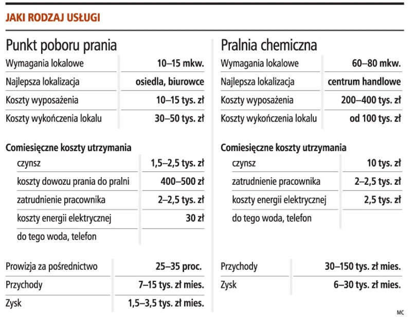 W punkcie pralniczym obroty wahają się od 7 tys. do 15 tys. zł. Okres zwrotu kapitału wynosi około roku. Aby punkt był dochodowy, musi dziennie przyjąć 70 sztuk garderoby, a miesięcznie jego przychód powinien wynieść 10 tys. zł. - Nie jest to trudne, bo bywają klienci, którzy przynoszą jednorazowo kilka rzeczy do czyszczenia, a ich rachunek sięga 200-300 zł - mówi właściciel jednego z punktów.