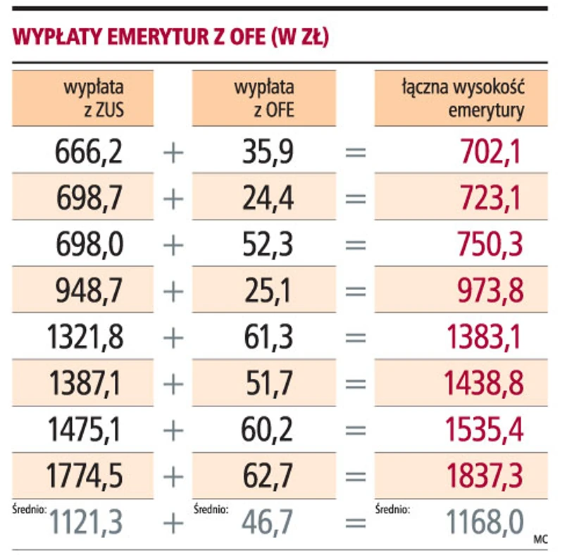 Przeciętna wysokość nowego świadczenia, które składa się z emerytury kapitałowej z ZUS i emerytury okresowej z OFE, wynosi 1168 zł. Najniższe świadczenie wynosi nieco ponad 700 zł, a najwyższe, wypłacane przez oddział Łódź I - prawie 1837,3 zł. Z tego 1774,5 zł pochodzi z ZUS, a 62,7 zł z OFE. Wskazuje to, że 60-letnia kobieta, która otrzymuje to świadczenie, ma zgromadzone na swoim rachunku w OFE niespełna 15,4 tys. zł.