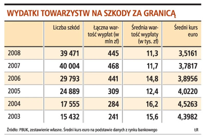 Według danych Polskiego Biura Ubezpieczycieli Komunikacyjnych w 2008 roku towarzystwa wypłaciły 445 mln zł tytułem 39,5 tys. szkód spowodowanych przez polskich kierowców za granicą. To nieco mniej niż rok wcześniej. Dziwi szczególnie spadek średniej wartości szkody z 11,7 tys. zł w 2007 roku do 11,3 tys. zł w 2008 roku.