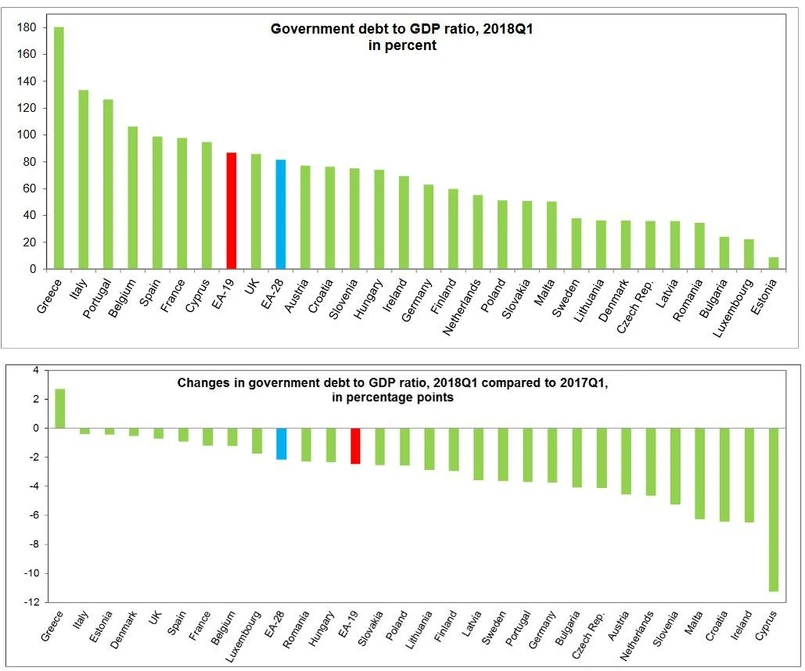 Najniższym zadłużeniem w relacji do PKB w I kw. 2018 roku mogły pochwalić się Estonia, Luksemburg, Bułgaria, Rumunia i Łotwa.