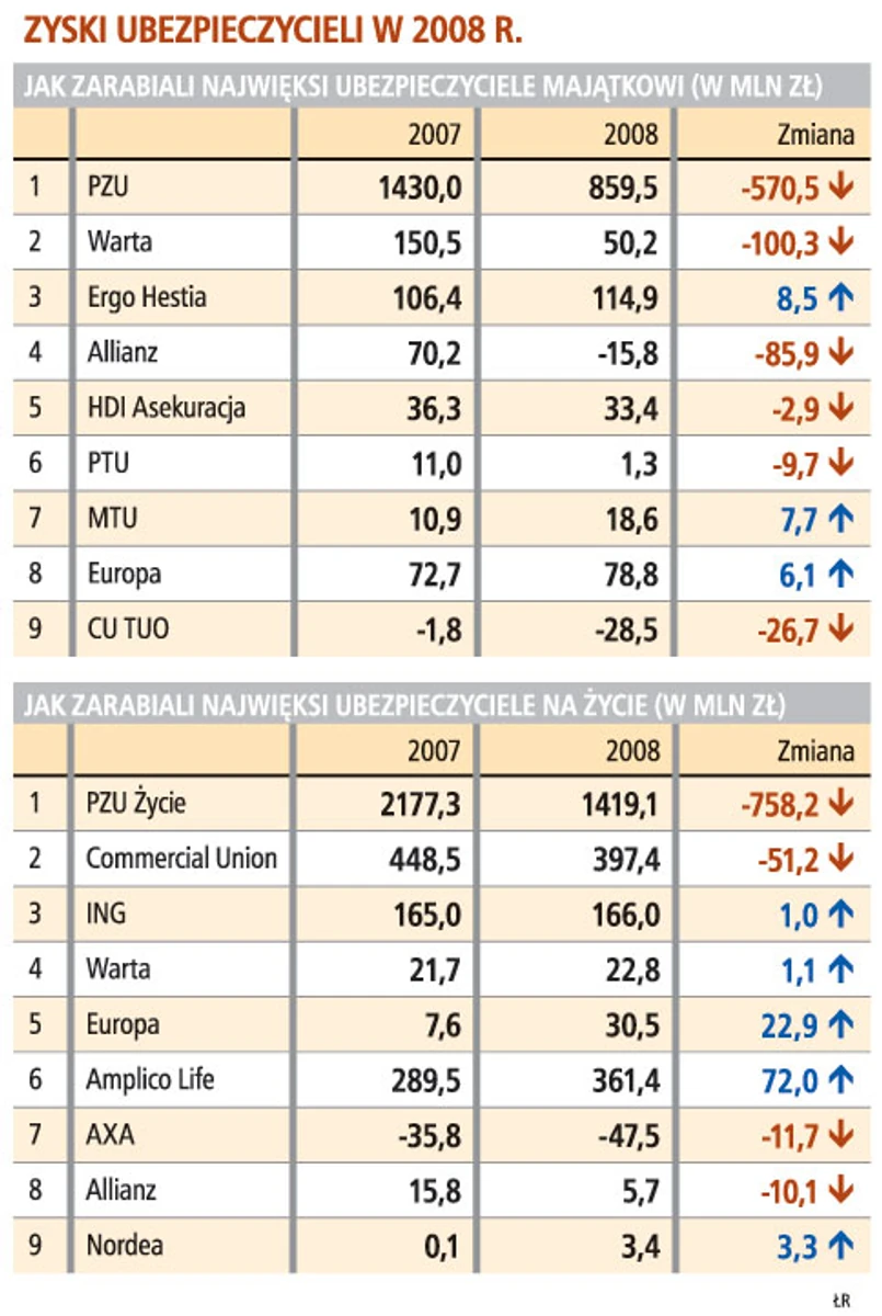 Pozostali ubezpieczyciele majątkowi również tłumaczą niższe zyski stratami z inwestycji. 16 mln zł strata Allianz to głównie efekt założenia Allianz Banku. Gdyby nie te wydatki, zysk wyniósłby 70 mln zł. 28,5 mln zł straty Commercial Union to efekt inwestycji w rozwój marki CU Direct. Mniejsze zyski zanotowali ubezpieczyciele życiowi i obawiają się, czy sytuacja na rynkach nie pociągnie ich dalej w dół. Ale może pojawić się element poprawiający w krótkim terminie zyski.