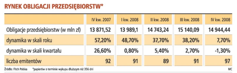Zaostrzone kryteria kredytowe zmuszają firmy do szukania alternatywnych źródeł finansowania. Takim źródłem mogą być obligacje korporacyjne. Na razie nie widać jednak gwałtownych zmian. - Z danych z rynku za IV kwartał 2008 r. można wysnuć wniosek, że popyt na obligacje korporacyjne spada - mówi Mirosław Dudziński, dyrektor Fitch Ratings.
