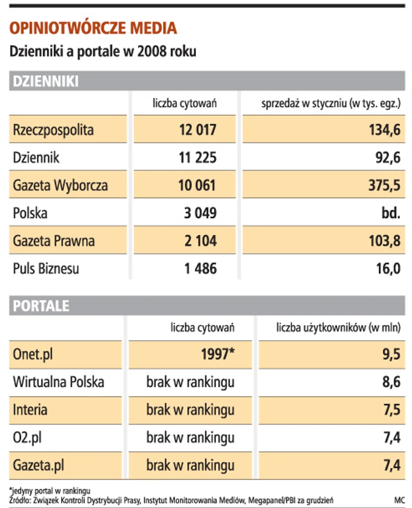 W zestawieniu jest tylko jeden portal internetowy ogólnoinformacyjny: Onet.pl. Zajmuje 12 pozycję. Cytowany był niespełna 2 tys. razy. Jednak jego liczba użytkowników - ponad 9,5 mln miesięcznie - jest większa niż suma wszystkich kupujących gazety i magazyny znajdujące się w rankingu. Reszta serwisów internetowych w tym rankingu się nie liczy, bo większość z nich (poza np. TVN24. pl) praktycznie nie wytwarza własnych treści. Przyciągają jednak użytkowników informacjami za darmo.