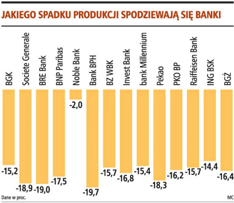 Średnia oczekiwań ekonomistów bankowych, z którymi rozmawialiśmy, zakłada roczny spadek produkcji o 15,8 proc. Najwięksi optymiści - jak Alfred Adamiec z Noble Bank - także spodziewają się spadku, ale nie aż w takiej skali.