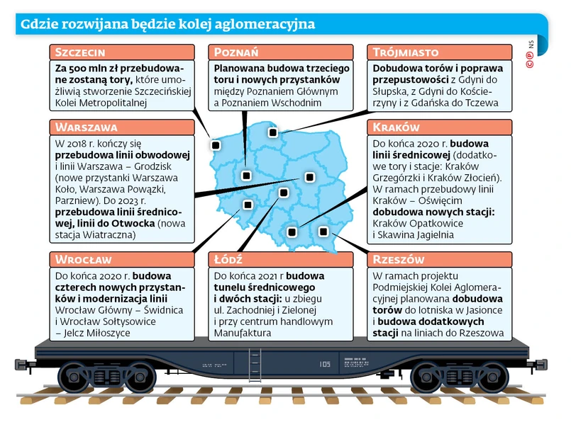 Rewolucyjne zmiany także w Krakowie. Pół roku temu powstała estakada kolejowa, która ułatwiła wyjazd na południe, np. do Skawiny. Teraz trwają prace na znacznie większą skalę. Na wzór Warszawy na odcinku Kraków Główny – Kraków Bieżanów dobudowywane są dwa tory dla pociągów aglomeracyjnych. To poprawi przepustowość i pozwoli uruchamiać częste kursy. Powstanie też kilka nowych stacji, m.in. przy osiedlu w Bronowicach. Koniec prac zaplanowano w 2020 r. – To przełom w komunikacji. Dojazdy z przedmieść staną się łatwiejsze. Zakładamy, że na nowym przystanku przy ul. Dietla będzie wysiadać więcej pasażerów niż na Dworcu Głównym. Pracujemy nad tym, by przesiadki do tramwajów były w tym miejscu jak najwygodniejsze – mówi Bartosz Piłat z krakowskiego Zarządu Infrastruktury Komunalnej i Transportu. Samorząd województwa małopolskiego od kilku lat tworzy system Szybkiej Kolei Aglomeracyjnej. To linie: Wieliczka – Kraków – lotnisko Balice, Skawina – Kraków – Sędziszów i Tarnów – Kraków. Samorząd województwa ma teraz 34 pociągi, a docelowo chce podwoić tę liczbę.