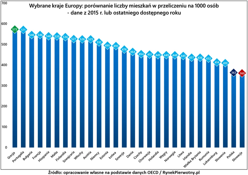 Mimo znaczącego wzrostu liczby mieszkań przypadających na 1000 osób (1994 r. - 296, 2016 r. - 371), Polska pod względem tego wskaźnika nadal prezentuje się słabo na tle innych krajów Starego Kontynentu. Informacje udostępniane przez OECD wskazują, że wśród europejskich członków tej organizacji tylko Słowacja cechuje się podobnym nasyceniem mieszkaniami jak Polska (patrz poniższy wykres). W obydwu wspomnianych państwach (Polska i Słowacja), obecnie na 1000 mieszkańców przypada 360 - 370 domów oraz lokali. Ciekawy punkt odniesienia stanowią Czechy, które osiągnęły już poziom nasycenia mieszkaniami typowy dla krajów Europy Zachodniej. Mowa o wyniku wynoszącym około 450 - 500 mieszkań na 1000 osób (zobacz poniższy wykres). W niektórych krajach Europy (np. Grecji, Portugalii oraz Bułgarii) nasycenie mieszkaniami jest jeszcze większe. Taka sytuacja wiąże się jednak z obecnością dużej liczby lokali przeznaczonych dla turystów.