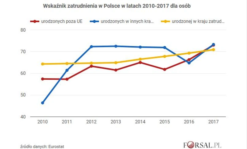 Od 2010 roku w Polsce wskaźnik zatrudnienia rośnie we wszystkich trzech kategoriach, przy czym najmocniej w przypadku osób urodzonych w innym kraju UE. Jeszcze w 2010 roku tylko 46,6 proc. imigrantów z innych państw UE miało pracę w Polsce. W 2017 r. wskaźnik ten zwiększył się o 26,9 pkt. proc. W tym samym okresie stopa zatrudnienia osób urodzonych poza UE wzrosła o 15,6 pkt. proc. Wskaźnik zatrudnienia osób w wieku 20-64 lata urodzonych nad Wisłą wynosił w zeszłym roku 70,9 proc.