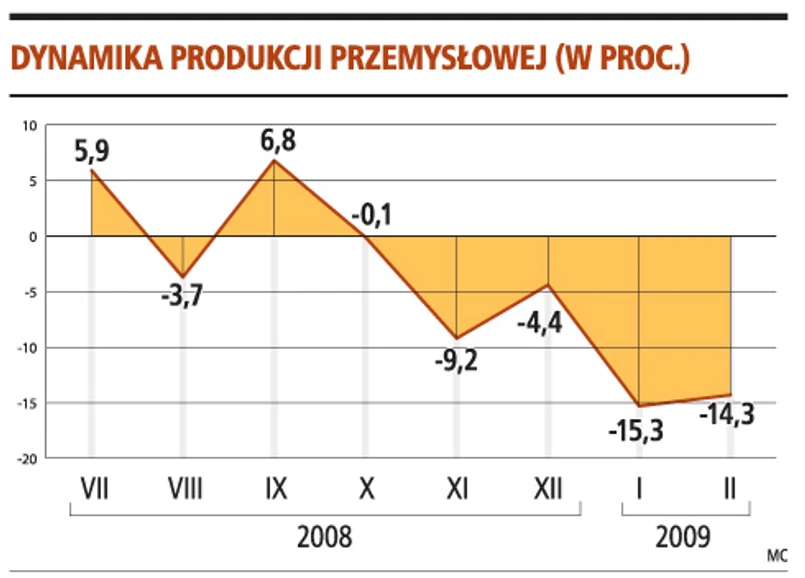 Optymistycznie nie nastrajają też wczorajsze dane GUS. Produkcja spadła co prawda mniej, niż spodziewał się rynek, bo o 14,3 proc. (prognoza GP wynosiła minus 15,8 proc.), ale w niektórych branżach, jak produkcja metali, nastąpiło całkowite załamanie. Tam spadek wyniósł ponad 36 proc.