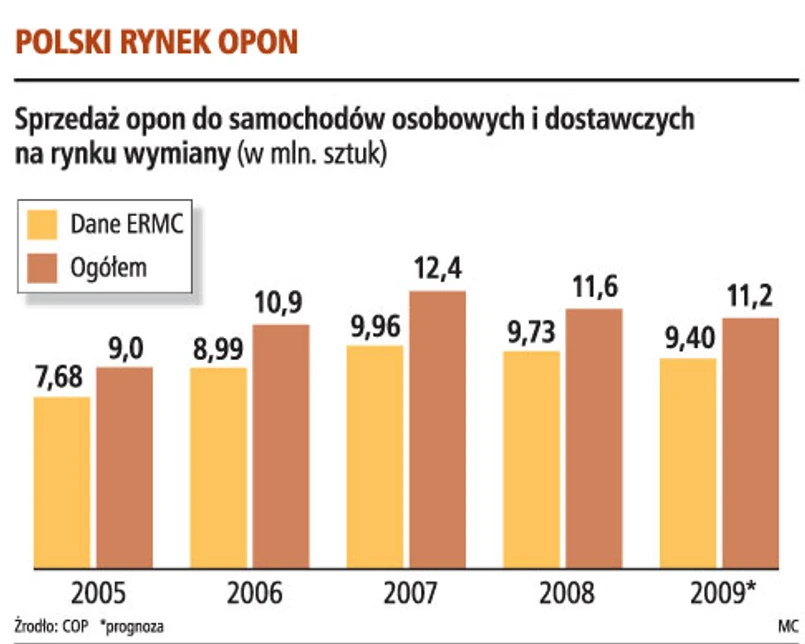 - Ze względu na słabego złotego Polska jest w tym roku jednym z największych w Europie eksporterów opon - mówi Piotr Zielak, dyrektor generalny COP. Różnica ceny detalicznej najdroższych opon w Polsce i Niemczech to kilkanaście procent. Opłaca się prywatny import. Według statystyki uwzględniającej dane przekazywane przez największych producentów firmie ERMC, sprzedaż opon na rynku wymiany wyniosła w 2008 roku 9,64 mln sztuk. Import z Azji to 11,6 mln sztuk.