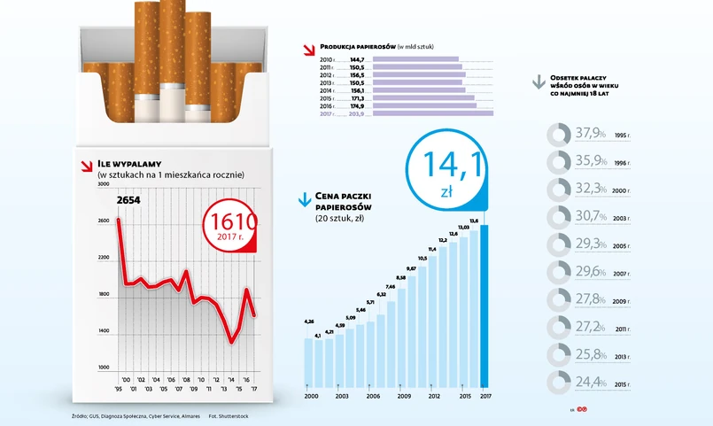 Jednak tytoniowych nałogowców i tak ubywa. Zdaniem ekspertów z Instytutu Ekonomiki Rolnictwa i Gospodarki Żywnościowej (IERiGŻ) przyczyny należy upatrywać w rosnących cenach wyrobów tytoniowych spowodowanym wysoką akcyzą. W 2017 r. za paczkę trzeba było średnio zapłacić 14,10 zł, o 50 groszy więcej niż w 2016 r. Osoba wypalająca 20 papierosów dziennie wydawała na swój nałóg 437 zł miesięcznie, czyli prawie jedną trzecią minimalnej pensji.