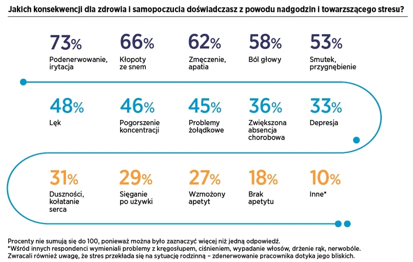 Przemęczenie pracą i stres mogą powodować kłopoty ze snem, na co skarży się 66 proc. pracowników wykonujących nadgodziny. 73 proc. doświadcza podenerwowania i irytacji, a 62 proc. – zmęczenia i apatii. Przepracowanie może też prowadzić do poważniejszych problemów. 45 proc. badanych stwierdziło, że konieczność pracy po godzinach powoduje u nich problemy żołądkowe, 33 proc. – depresję, 31 proc. – duszności i kołatanie serca, a 29 proc. – sięganie po używki.