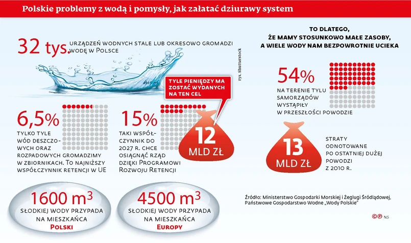 Rząd chce to zmienić. Pracuje nad Programem Rozwoju Retencji (PRR), czyli nową strategiczną inicjatywą, która ma kosztować ok. 12 mld zł. Ma być sposobem na łagodzenie skutków suszy oraz na zapobieganie powodziom i lokalnym podtopieniom. PRR zakłada ponad dwukrotną poprawę ilości magazynowanej wody, która dziś jest na najniższym poziomie w UE i wynosi niespełna 6,5 proc.