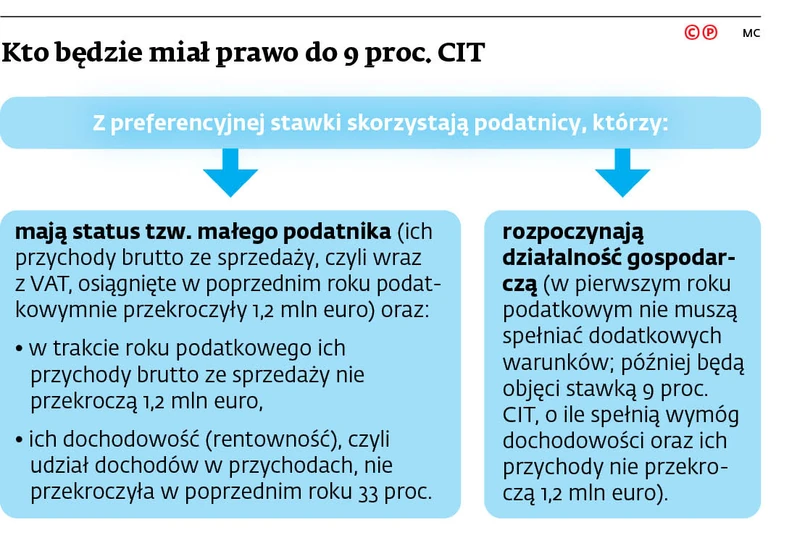 Drugim, również nowym warunkiem stosowania preferencyjnej stawki CIT będzie wskaźnik dochodowości (rentowności). Podatnik będzie mógł płacić 9 proc. CIT pod warunkiem, że udział jego dochodów w przychodach w poprzednim roku nie przekroczy 33 proc.