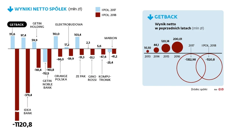 Z wynikiem przekraczającym 1,1 mld zł na minusie walcząca o przetrwanie firma windykacyjna GetBack pobiła w pierwszym półroczu rekord strat na naszym rynku kapitałowym. Chociaż gospodarka znajdowała się u szczytu koniunktury, to ponad 300 firm – zarówno takich, których akcje są notowane na rynku głównym, jak na NewConnect – wykazało w pierwszych sześciu miesiącach tego roku ujemny wynik. Było ich nawet więcej niż przed rokiem. A głównie za sprawą GetBacku zdecydowanie większa jest też ogólna wartość strat. Przed rokiem było to ponad 1,2 mld zł. Teraz przekroczona została granica 2 mld zł.