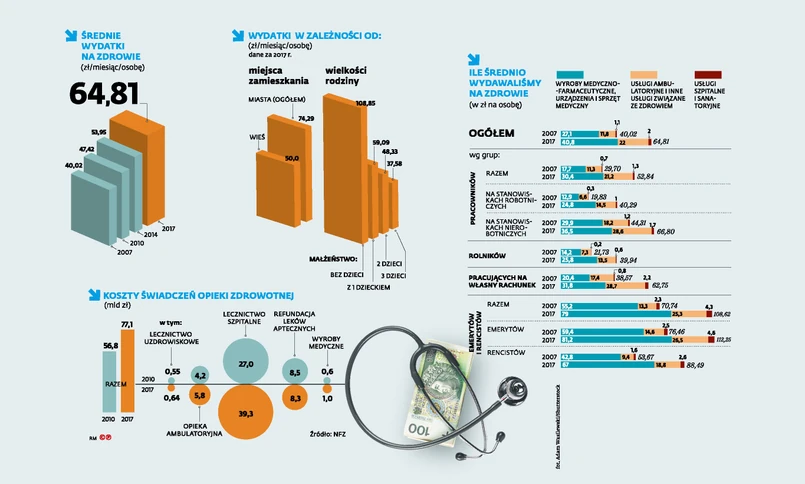 Na co najwięcej przeznaczamy? Obok leków, głównie na usługi ambulatoryjne czy na specjalistów. Dzieje się tak, pomimo że co roku rosną wydatki NFZ na leczenie. Powód jest od lat ten sam: długi czas oczekiwania.