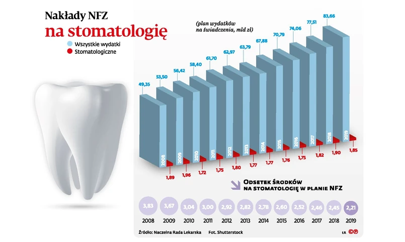 W ciągu ostatnich 10 lat procentowy udział stomatologii w wydatkach NFZ zmniejszył się niemal o jedną trzecią – z 3,83 proc. w 2008 r. do 2,45 proc. w tym roku. A w 2019 r. ma być jeszcze gorzej.