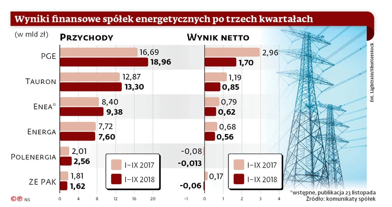 Dlaczego prezesi podległych resortowi energii spółek zdecydowali wbrew właścicielowi? Wystarczy spojrzeć na ich wyniki po trzech kwartałach. O ile przychody są wyższe i wyniosły 53,42 mld zł wobec 49,5 mld zł rok wcześniej (mówimy tu o „wielkiej czwórce” oraz ZE PAK i Polenergii łącznie), o tyle suma zysków netto spadła z 5,71 mld zł do 3,66 mld zł. A przecież PGE i Enea urosły (pierwsza przejęła aktywa EDF, druga Engie). Tymczasem hurtowa cena energii w III kw. była o 55 proc. wyższa niż rok wcześniej.