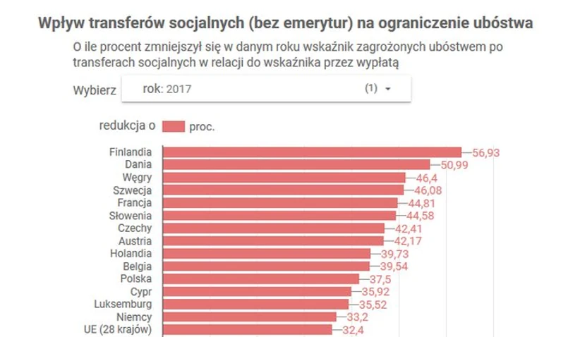 Zakres, w jakim transfery socjalne zmniejszają zagrożenie ubóstwem, jest różny w poszczególnych państwach członkowskich UE. W 2017 r. w dwóch krajach członkowskich odsetek ten zmniejszył się o ponad połowę w wyniku transferów socjalnych. W Finlandii wskaźnik zagrożenia ubóstwem po transferach socjalnych zmalał z 26,7 do 11,5 proc., czyli o 57 proc., a w Danii redukcja ta wyniosła 51 proc. W dziewięciu państwach członkowskich redukcja ubóstwa wyniosła poniżej 25 proc. Najmniejszą korektę odnotowano w Grecji, gdzie tylko 16 proc. osób poprawiło swój status, przekraczając próg ubóstwa po transferach socjalnych.